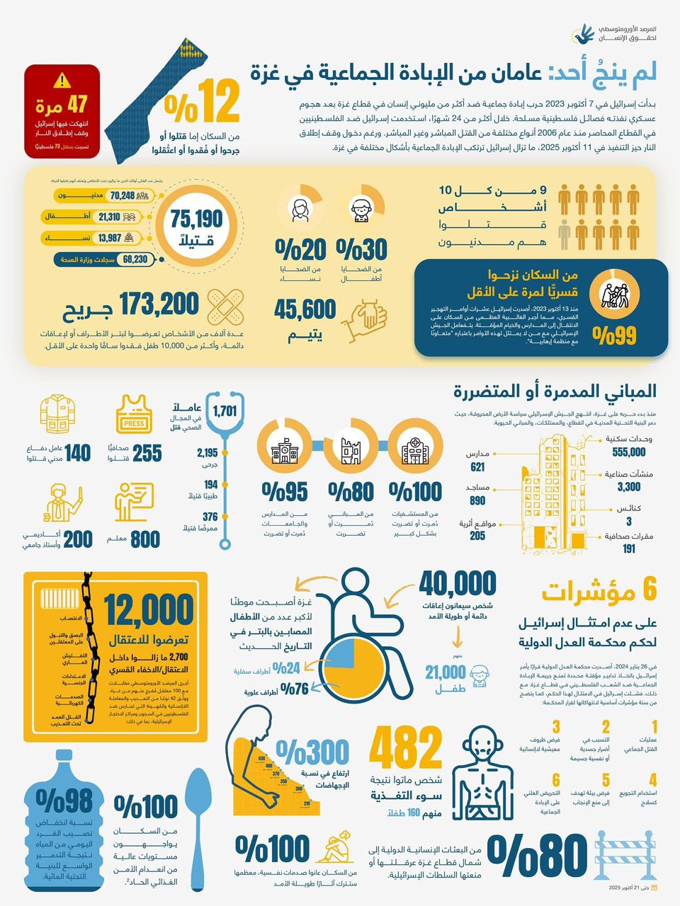 وأصدر المرصد الأورومتوسطي لحقوق الإنسان حصيلة شاملة توثّق آثار أكثر من عامين من جريمة الإبادة الجماعية في قطاع غزة، وتشمل القتل والإصابات والاعتقالات التعسفية والتدمير ونزع الملكية، فضلًا عن التهجير القسري وانعدام الأمن الغذائي والحرمان من خدمات الصحة والتعليم والآثار النفسية التي طالت جميع سكان القطاع المحاصر.